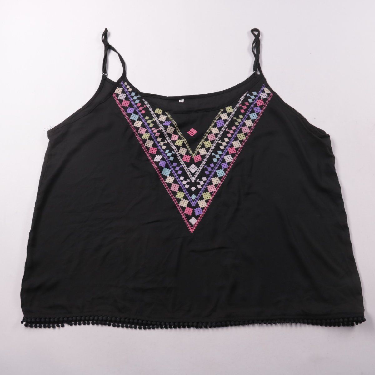 Чёрный женский топ на тонких бретелях с V-образным вырезом и яркой геометрической вышивкой спереди. Подойдёт для лета и отдыха, легко сочетается с джинсами, шортами и юбками. Лёгкая синтетическая ткань быстро сохнет и почти не мнётся.