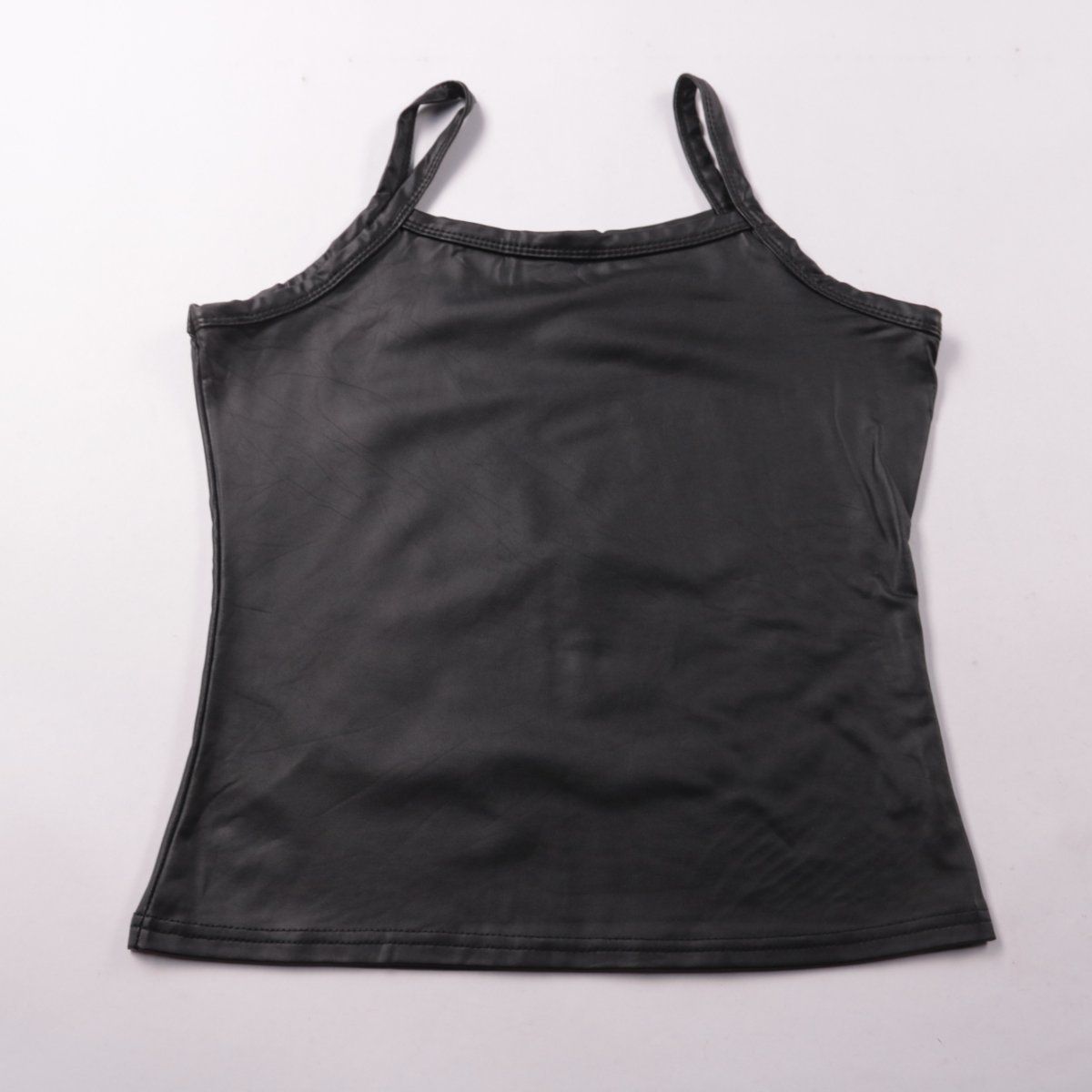 Чёрный облегающий топ на тонких бретелях без бренда, выполнен из гладкой эластичной ткани. Подойдёт для повседневной носки и как базовый слой под жакет или рубашку. Практичен тем, что хорошо тянется и почти не мнётся.