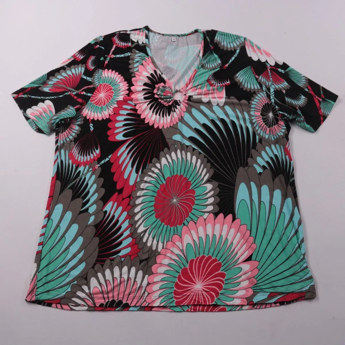 Женская футболка из вискозного трикотажа с V-образным вырезом и коротким рукавом, без бренда на бирке. Разноцветный принт на чёрном фоне подходит для повседневных образов и отдыха. Ткань со стрейчем комфортно садится по фигуре и не сковывает движения.