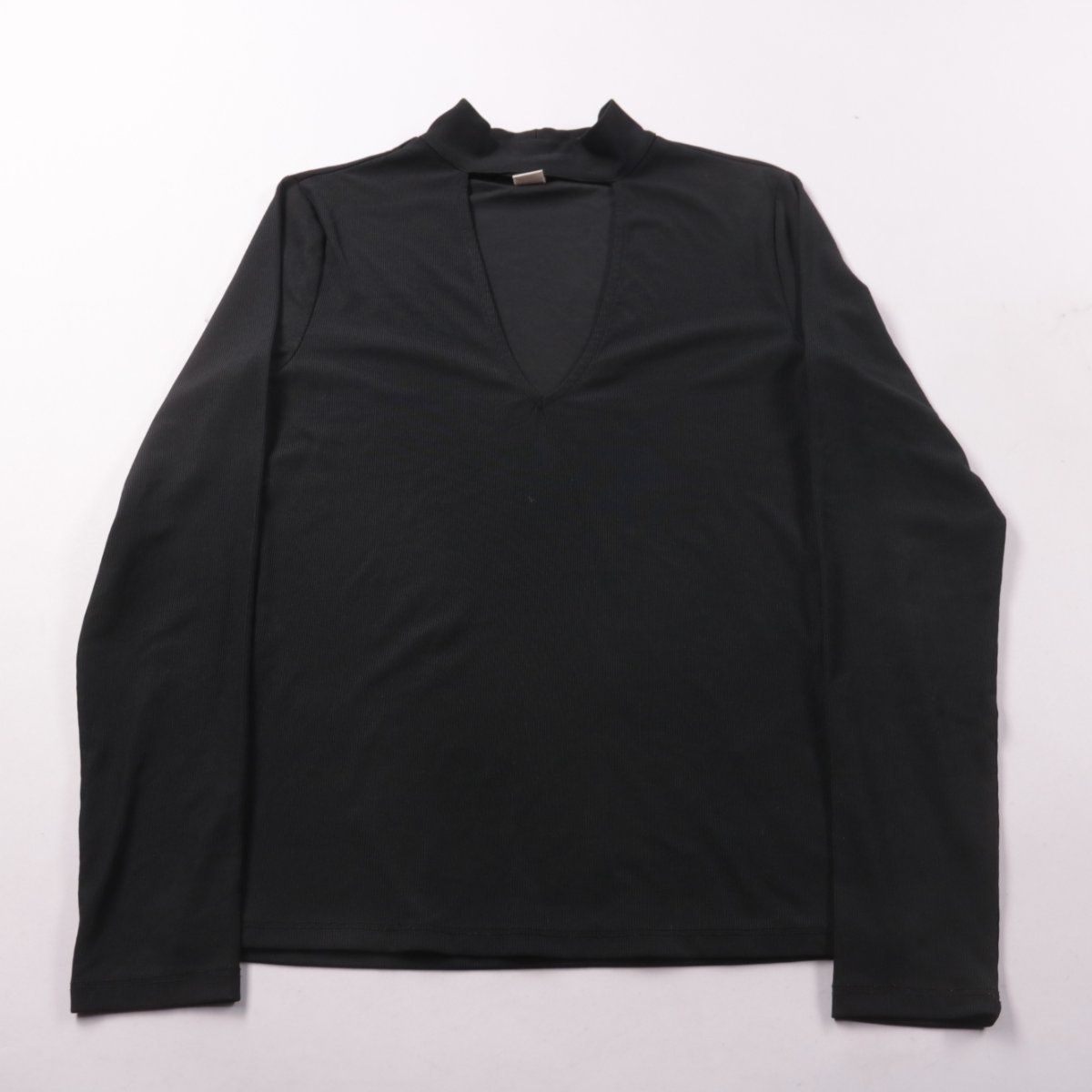 Чёрный женский лонгслив с V-образным вырезом и воротником-стойкой. Подойдёт для повседневных образов и как базовый слой в прохладную погоду. Тянущийся материал комфортно садится по фигуре и не сковывает движения.