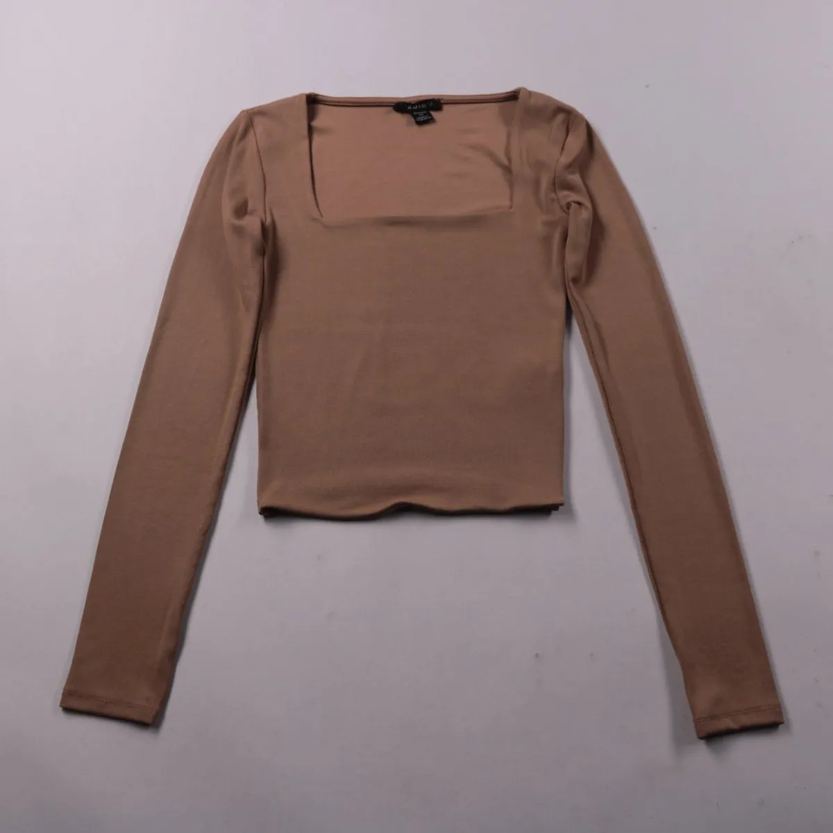 Лонгслив AMISU бежевого цвета с квадратным вырезом и облегающим кроем. Подойдёт для повседневных образов и сочетаний с джинсами или юбкой. Эластичная ткань хорошо тянется и комфортно садится по фигуре.