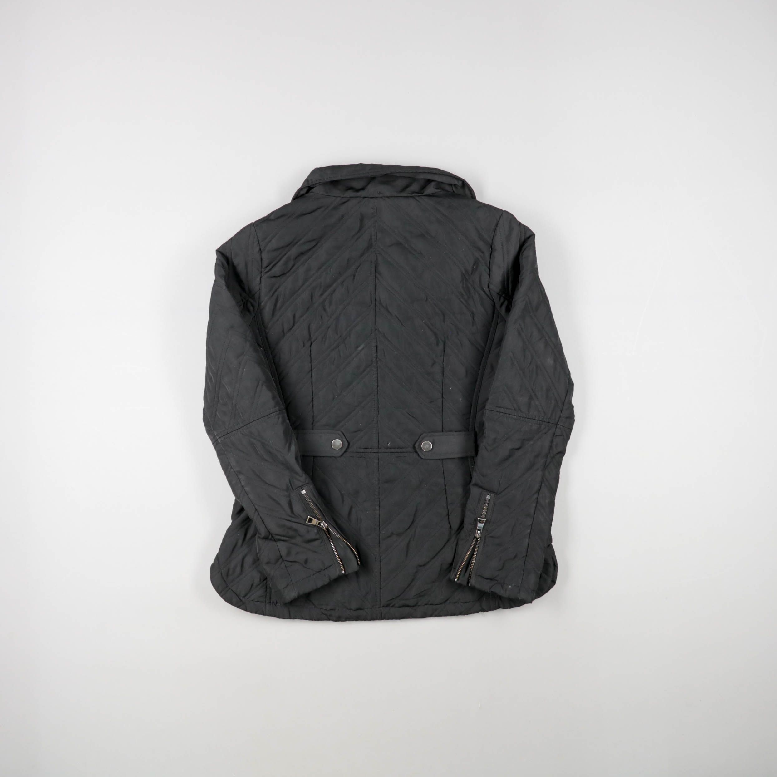 Стёганая женская куртка с асимметричной молнией и высоким воротником-стойкой. Подойдёт для повседневных образов в прохладную погоду весной и осенью. Практичные карманы на молнии и плотная посадка по талии помогают защититься от ветра.