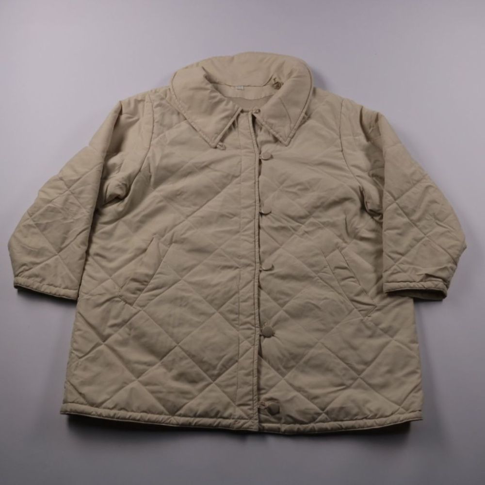 Стёганая демисезонная куртка бежевого цвета с отложным воротником и застёжкой на кнопки. Подойдёт для прохладной погоды весной и осенью, удобно носить поверх свитера. Практичный плюс — лёгкая, быстро сохнет и проста в уходе.