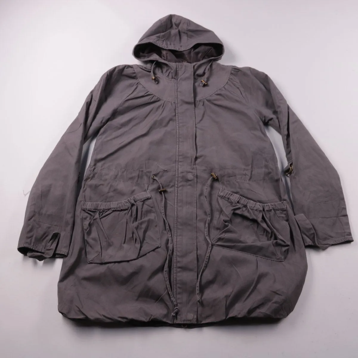 Женская демисезонная куртка Cheer серого цвета с капюшоном и крупными накладными карманами. Подойдёт для прохладной весны и осени, есть кулиски для регулировки посадки по талии и капюшону. Практичный вариант на каждый день благодаря плотной хлопковой ткани и подкладке.