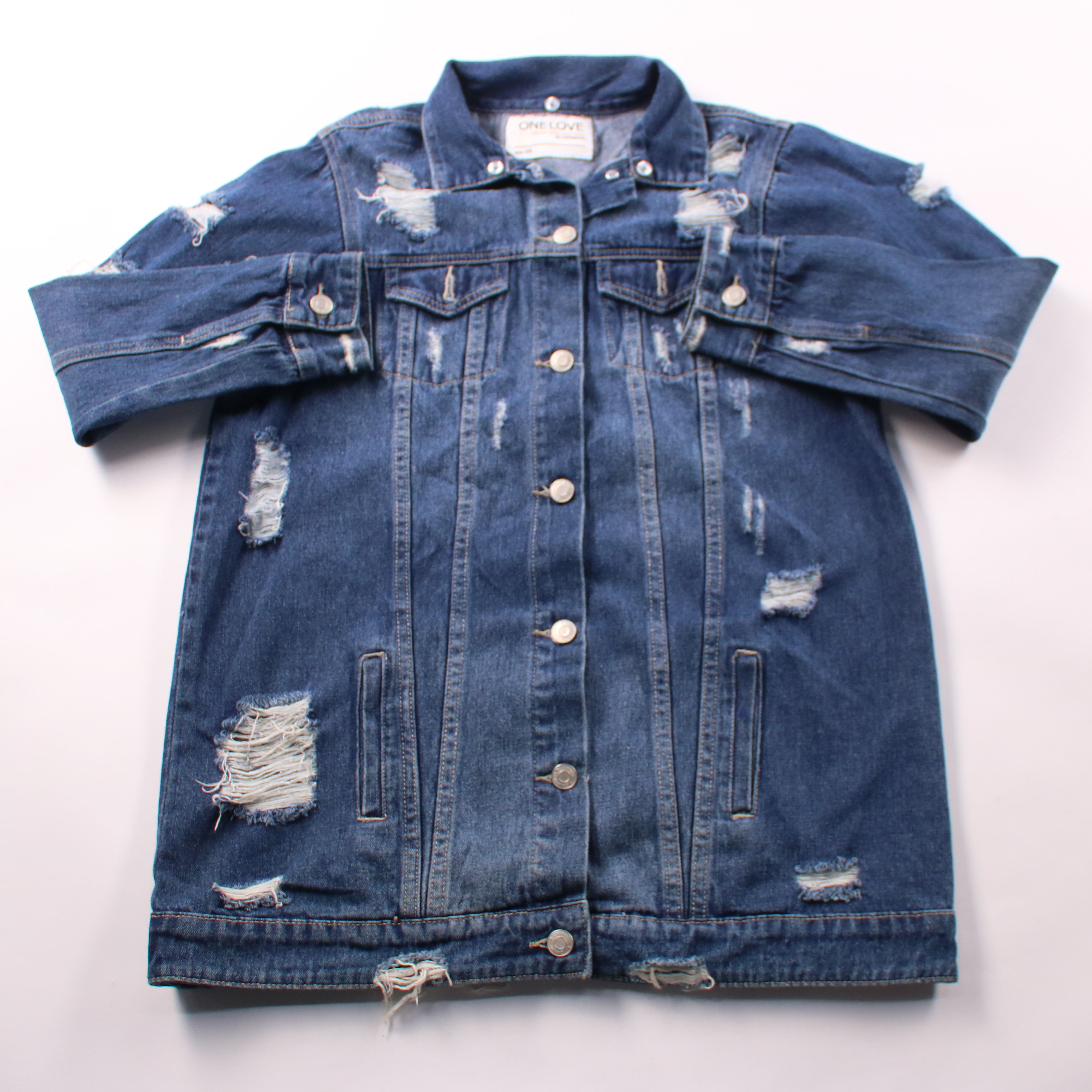 Джинсовая куртка One Love (Denim Collection by Colloseum) в синем цвете, с эффектом потертостей и рваными элементами. Подойдёт для демисезона и прохладных летних вечеров, хорошо смотрится с джинсами, платьями и кедами. Плотный деним и застёжка на пугов...