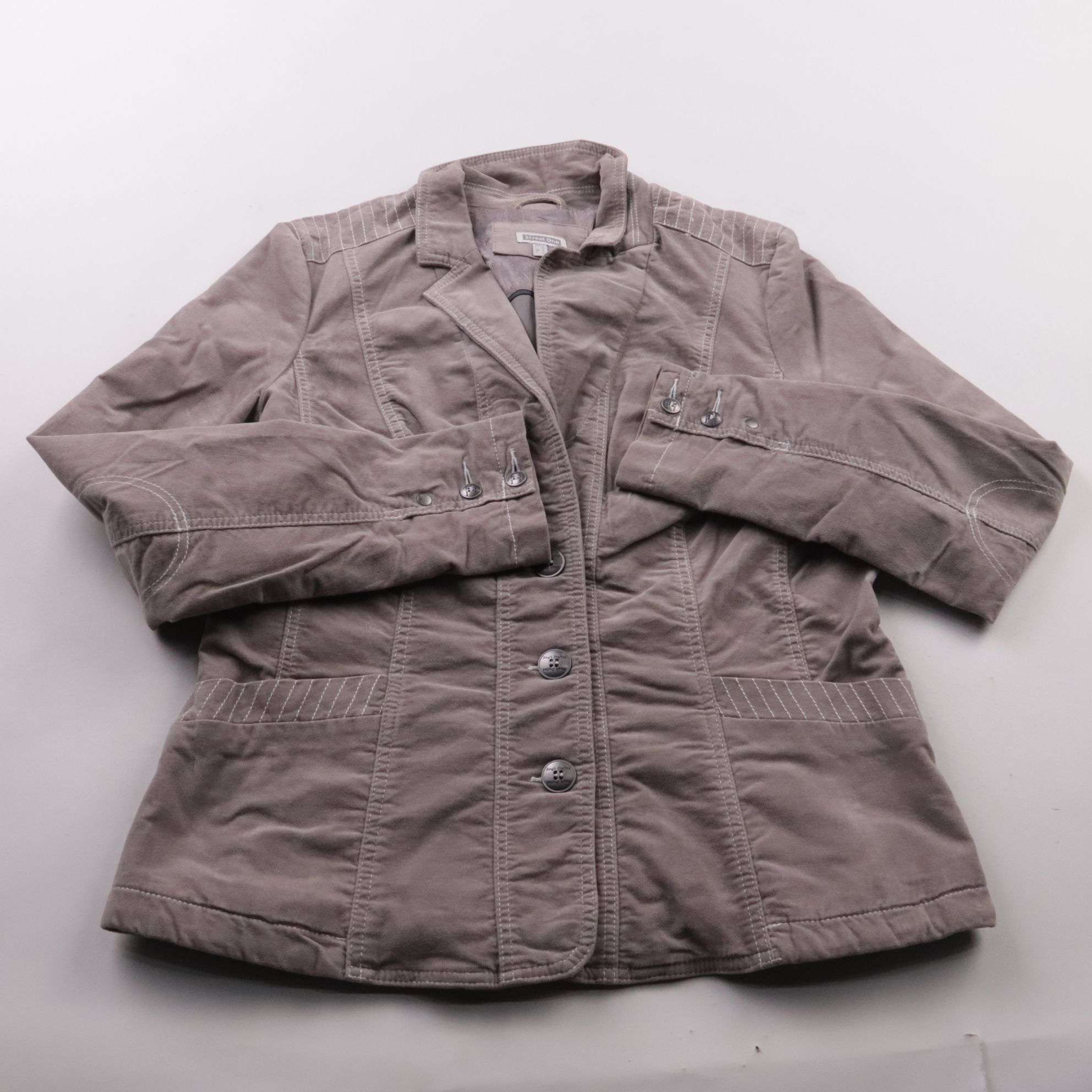 Лёгкая куртка Street One серо-коричневого оттенка с отложным воротником и застёжкой на пуговицы. Подойдёт для прогулок и повседневной носки в прохладную погоду, удобно сочетается с джинсами и брюками. Практичные карманы и хлопковый верх с эластаном дел...