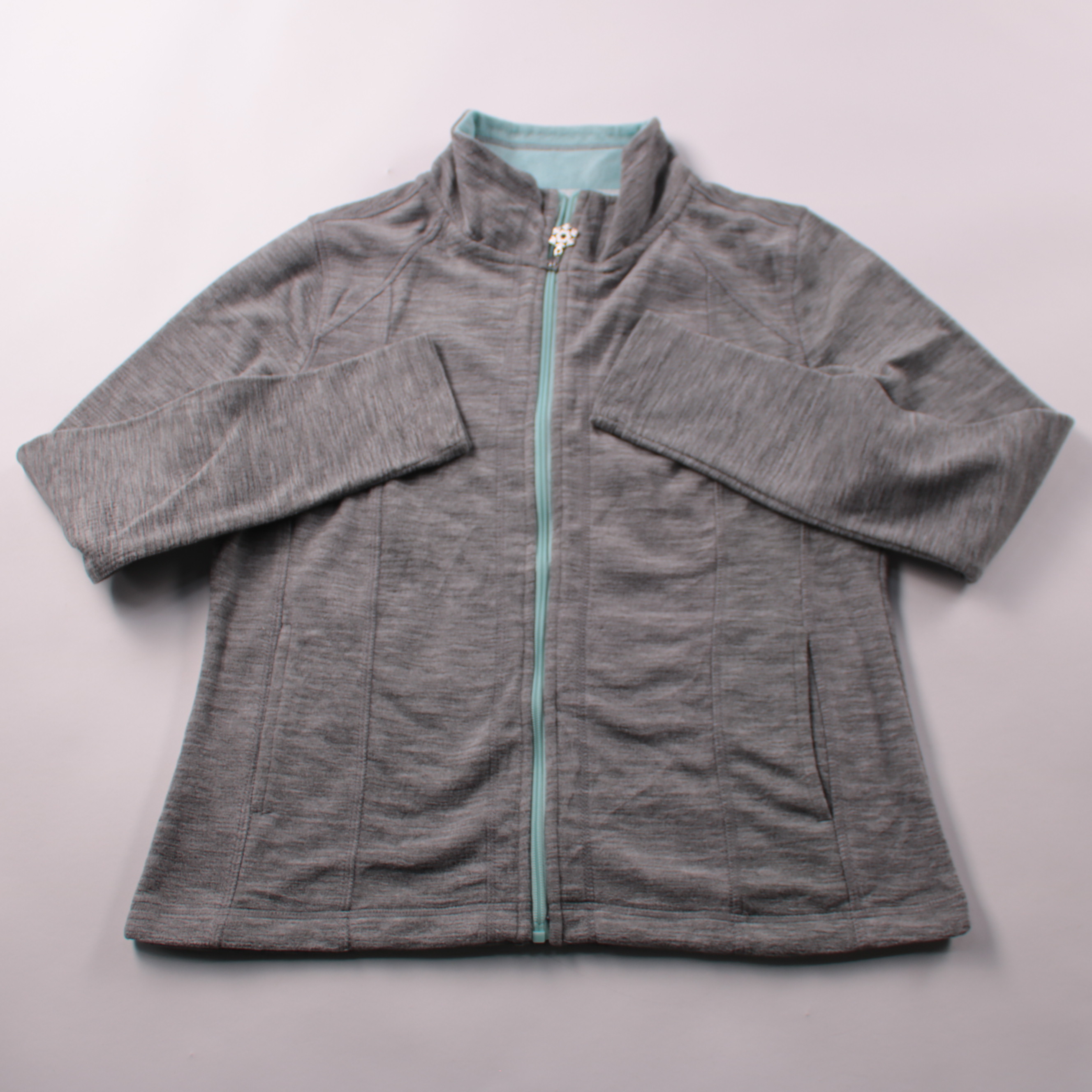 Лёгкая куртка Tu из полиэстера серого меланжа с мятной молнией и воротником-стойкой. Подойдёт для прогулок и повседневной носки в прохладную погоду. Практична тем, что быстро сохнет и легко стирается.