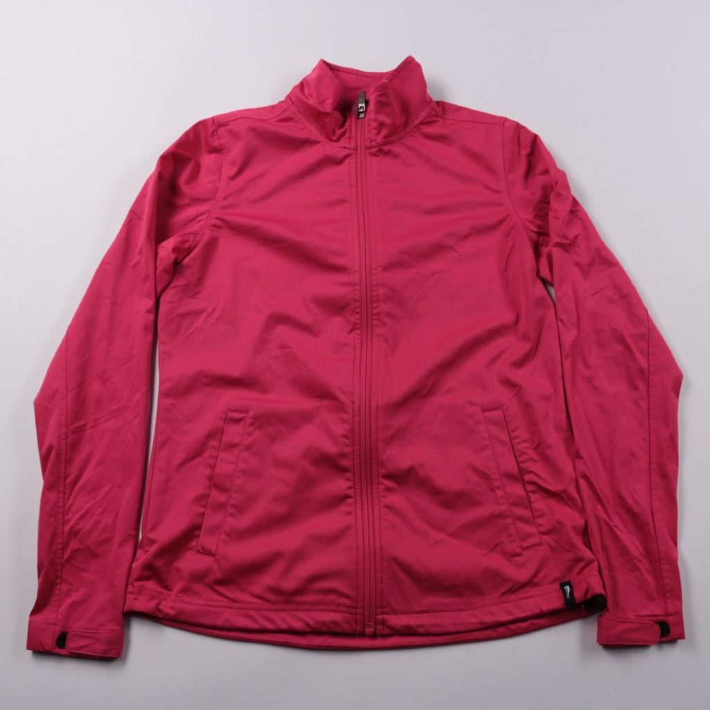 Женская ветровка на молнии без указанного бренда, ярко-розового (фуксия) цвета, с воротником-стойкой и боковыми карманами. Подойдёт для прогулок и активных дел в прохладную погоду весной и осенью. Лёгкая синтетическая ткань быстро сохнет и не занимает ...