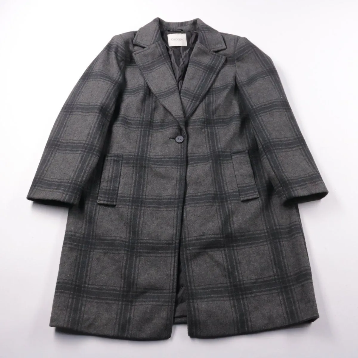 Женское пальто George в сером цвете с клетчатым рисунком и отложным воротником. Подойдёт для повседневных и офисных образов в прохладную погоду весной и осенью. Практично тем, что легко сочетается с базовыми вещами и не маркое.