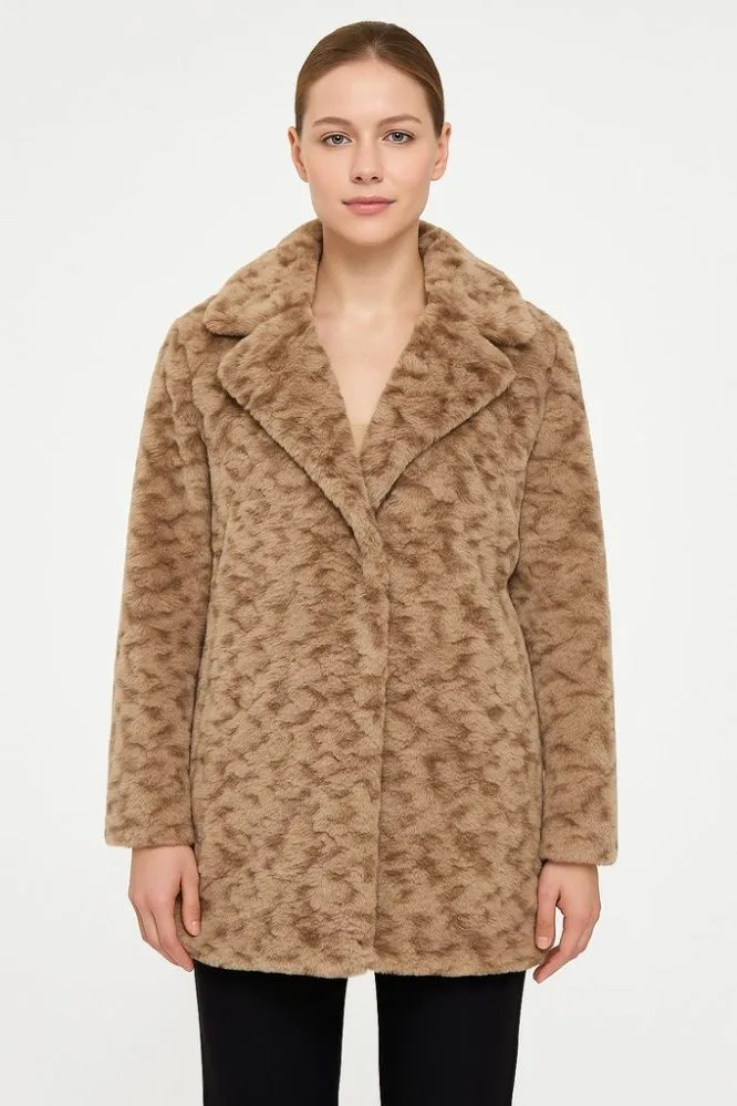 Женская шуба из искусственного меха в бежево-коричневом оттенке, производство Италия. Модель с отложным воротником и прямым силуэтом подойдёт для повседневных зимних образов и поездок по городу. Практичное преимущество — материал 100% полиэстер, легко ...