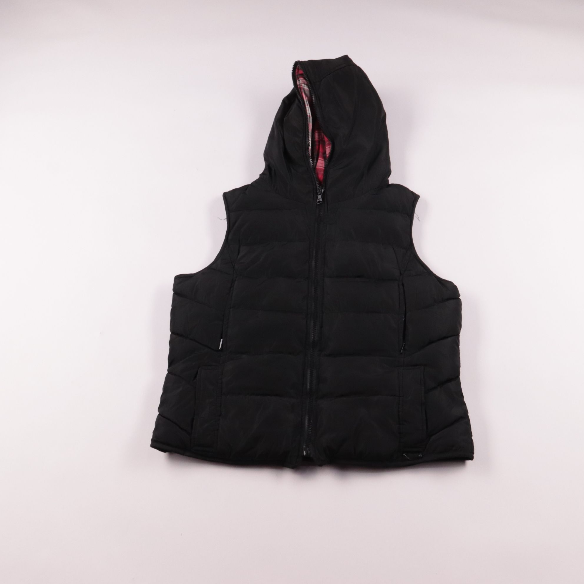 Стёганый утеплённый жилет Zara TRF с капюшоном и молнией, выполнен в чёрном цвете. Подойдёт для прохладной погоды в межсезонье и для многослойных образов на каждый день. Практичный плюс — капюшон защищает от ветра, а жилет не сковывает движения.