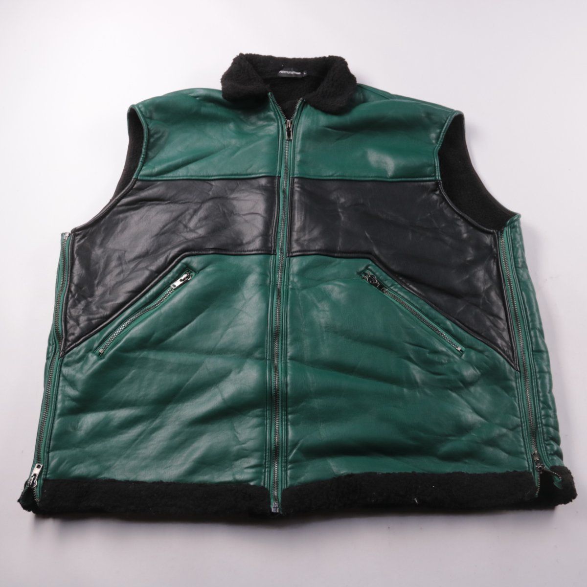 Женский жилет PrettyLittleThing из экокожи с контрастной чёрной вставкой и отделкой под мех по воротнику и низу. Подойдёт для прохладной погоды в демисезон и для многослойных образов. Застёжка на молнию и карманы на молнии — удобно для повседневной носки.