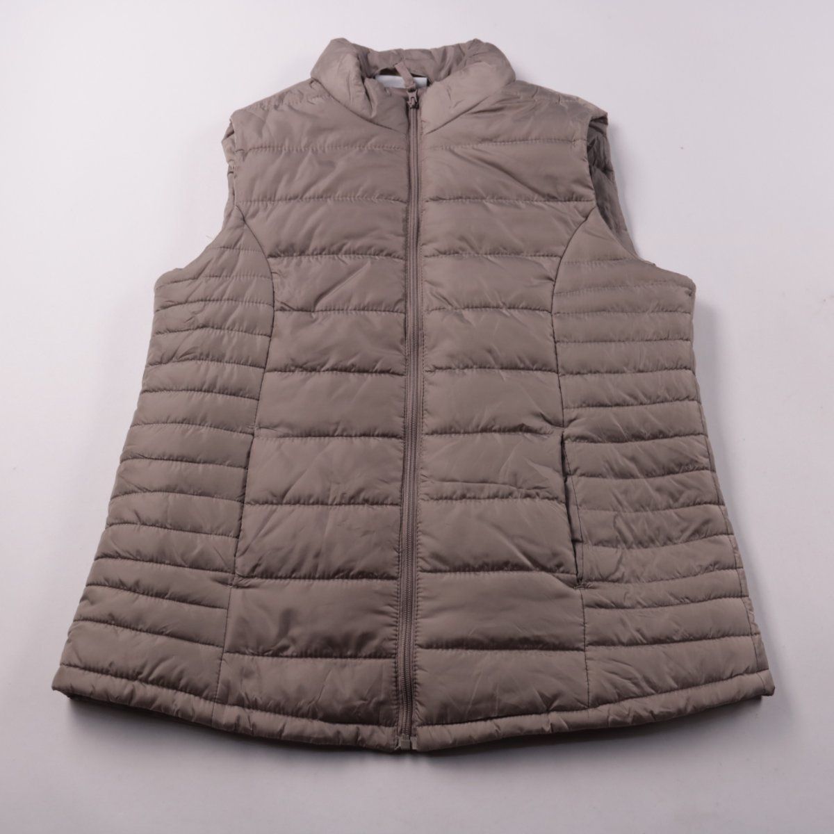 Стёганый утеплённый жилет Janina бежево-серо-го (тауп) оттенка, застёгивается на молнию и с высоким воротником. Подойдёт для прогулок и поездок в межсезонье, удобно носить поверх худи или свитера. Лёгкий и практичный в уходе за счёт полиэстера.