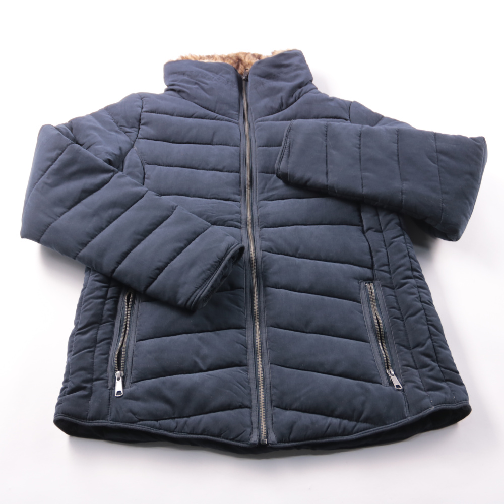 Стёганая зимняя куртка Gina тёмно-синего цвета с высоким воротником и меховой отделкой. Подойдёт для повседневной носки в холодную погоду, удобно сочетается с джинсами и тёплой обувью. Практичные карманы на молнии и утеплённая подкладка помогают сохран...