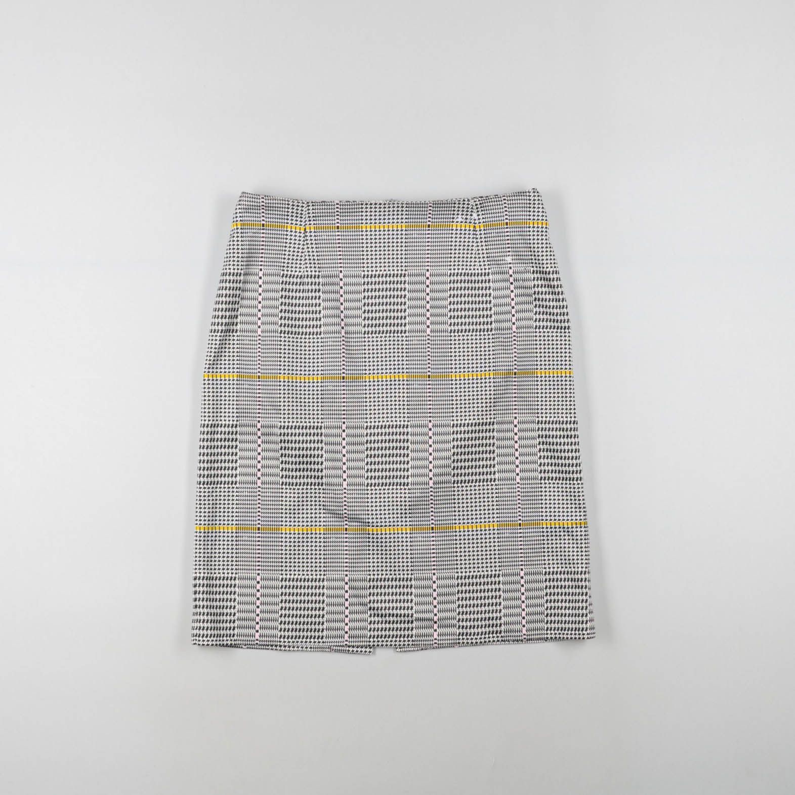 Женская юбка-карандаш в мелкую клетку (гленчек) с акцентными жёлтыми линиями. Подойдёт для офиса и повседневных образов с базовыми рубашками и джемперами. Плотная ткань держит форму и выглядит аккуратно.