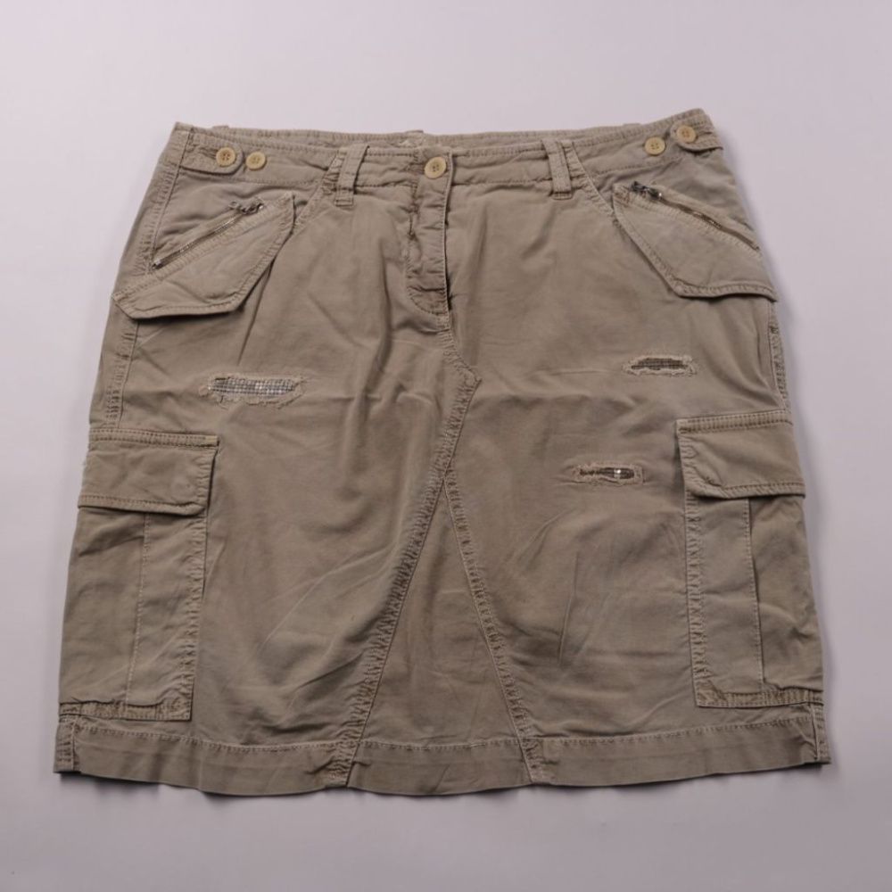 Женская хлопковая юбка-сафари с накладными карманами и декоративными потертостями/разрезами. Подойдет для повседневных летних образов и поездок, когда нужны удобство и свобода движений. Практичный плюс — много карманов для мелочей.