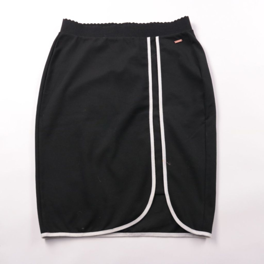 Юбка Dept чёрного цвета с белой окантовкой и декоративной отделкой спереди. Подойдёт для повседневных образов и офиса с базовыми топами и жакетом. Эластичная ткань хорошо садится по фигуре и не сковывает движения.