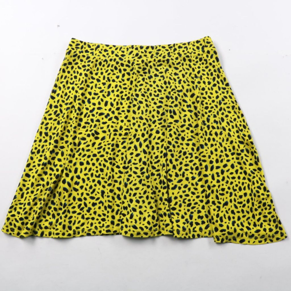 Летняя юбка George ярко-жёлтого цвета с чёрным пятнистым принтом и расклёшенным силуэтом. Подойдёт для прогулок и отпускных образов, легко сочетается с однотонными топами и футболками. Мягкая вискозная ткань комфортна в жару и хорошо драпируется.