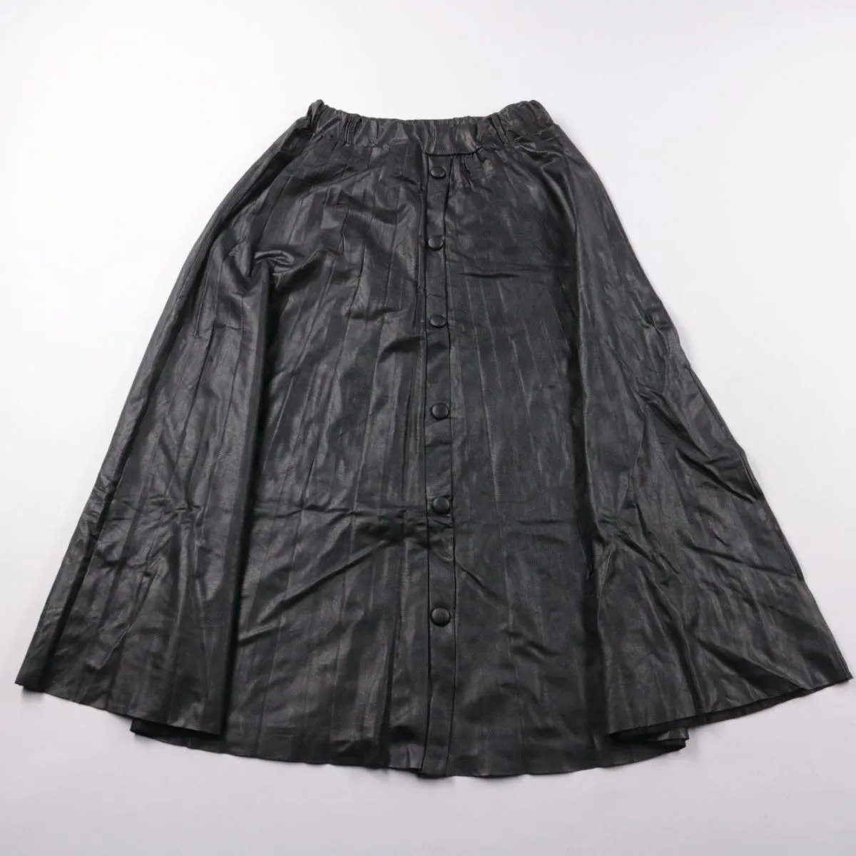 Чёрная юбка на эластичном поясе с застёжкой на кнопки по всей длине, выполнена из материала под кожу. Подойдёт для повседневных образов и вечерних выходов, хорошо сочетается с базовыми топами и рубашками. Практичный плюс — кнопки позволяют регулировать разрез и удобны в носке.
